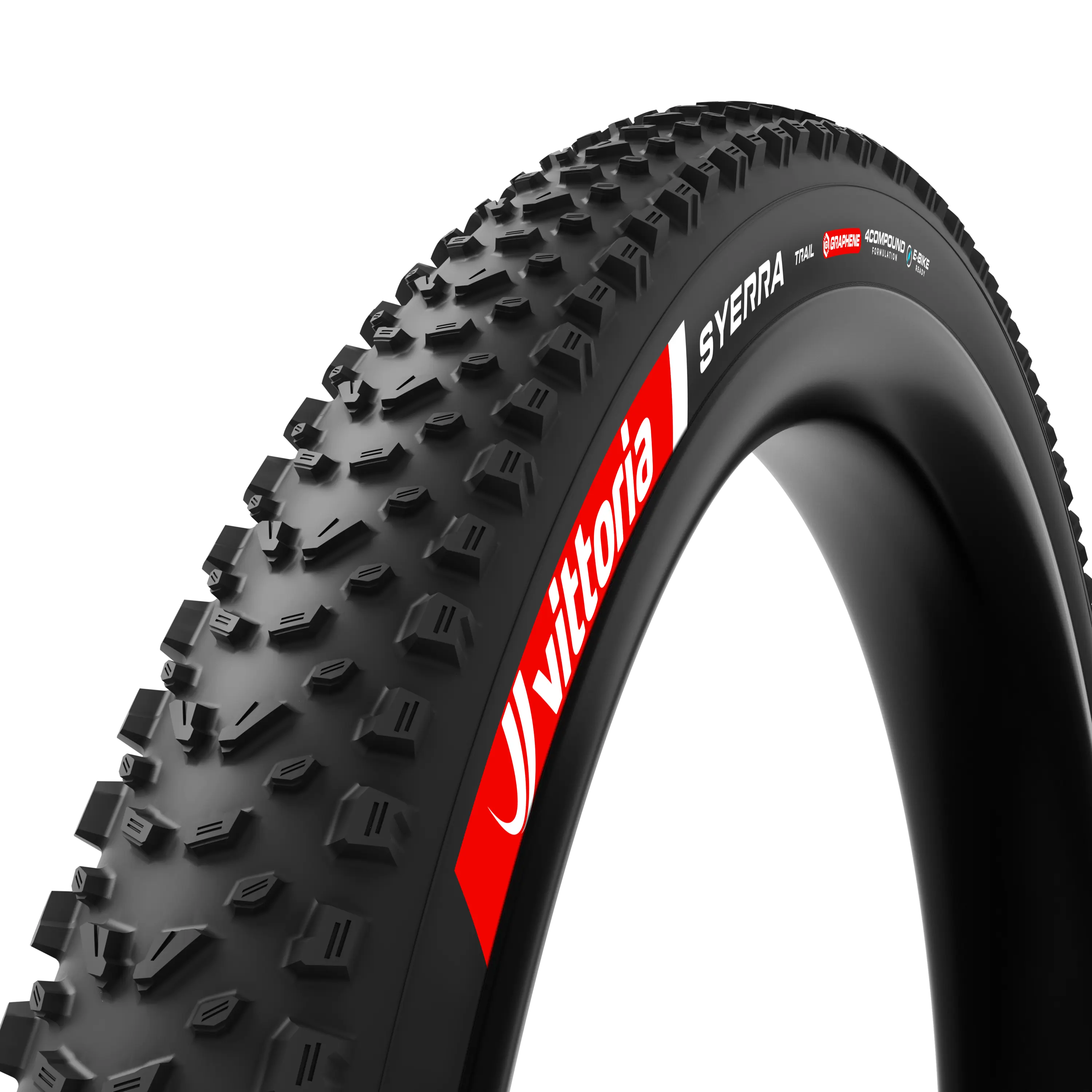 Aggressive, all-mountain tire when your hunger is for "some-of-everything, please". When your trail takes you up the steeps and down the knar, Syerra Trail is built for riders who demand downcountry balance and reliability across every section of the trail. A fast-rolling, high-grip center strip gives smooth acceleration and confident climbing, while aggressive shoulder tread provides control and stability on descents. Spaced, shaped, and siped knobs bite into rocks, roots, and loose terrain, ensuring you stay planted even in challenging conditions. The spacious knob layout balances speed, float, and self-cleaning performance, making Syerra ready for all-condition riding. Vittoria’s 4Compound Formulation strategically places four optimized compounds where they’re needed, delivering a perfect mix of speed, grip, and durability. The Trail casing combines light weight with toughness, featuring a tubeless-ready nylon construction, reinforced sidewalls, and an anti-puncture belt - ready to tackle technical climbs, fast descents, and everything in between.